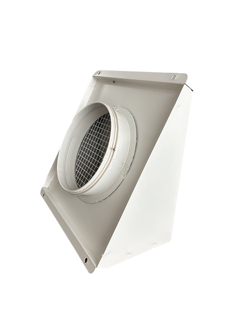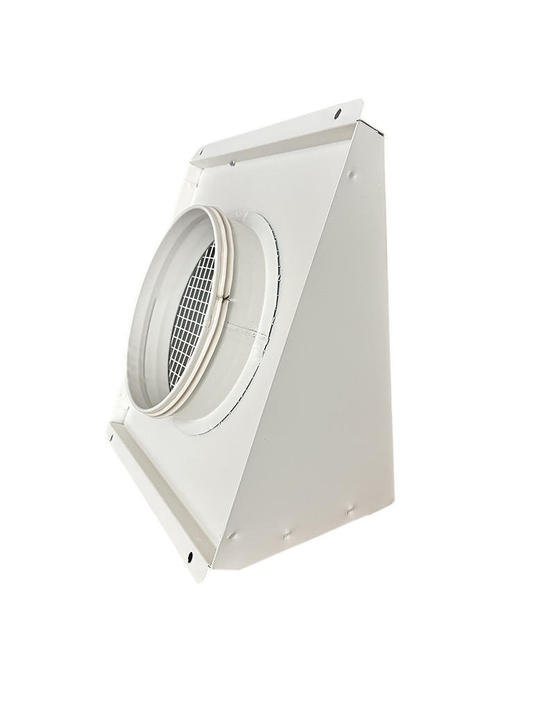 - Czerpnia, wyrzutnia powietrza pionowa fi 200 biała. Zakończenie systemu wentylacji mechanicznej po stronie wlotu i wylotu powietrza. Trapezowa konstrukcja frontu przedniego zabezpiecza przed zaciąganiem deszczu lub śniegu do instalacji.