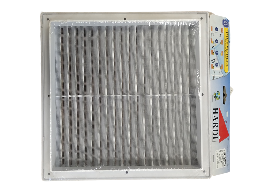 • HARDI Kratka wentylacyjna 28x28 z siatką skośna, żaluzją wewnętrzną i ramką w mur.