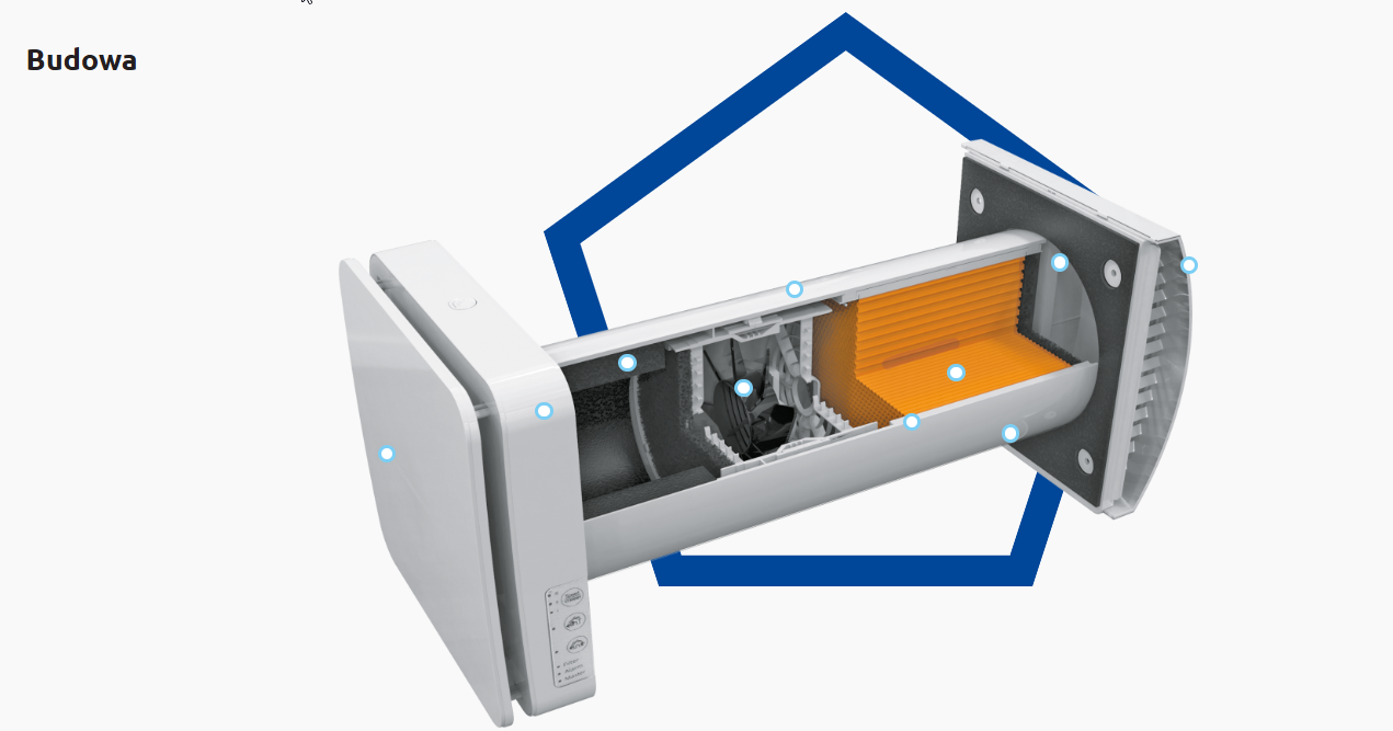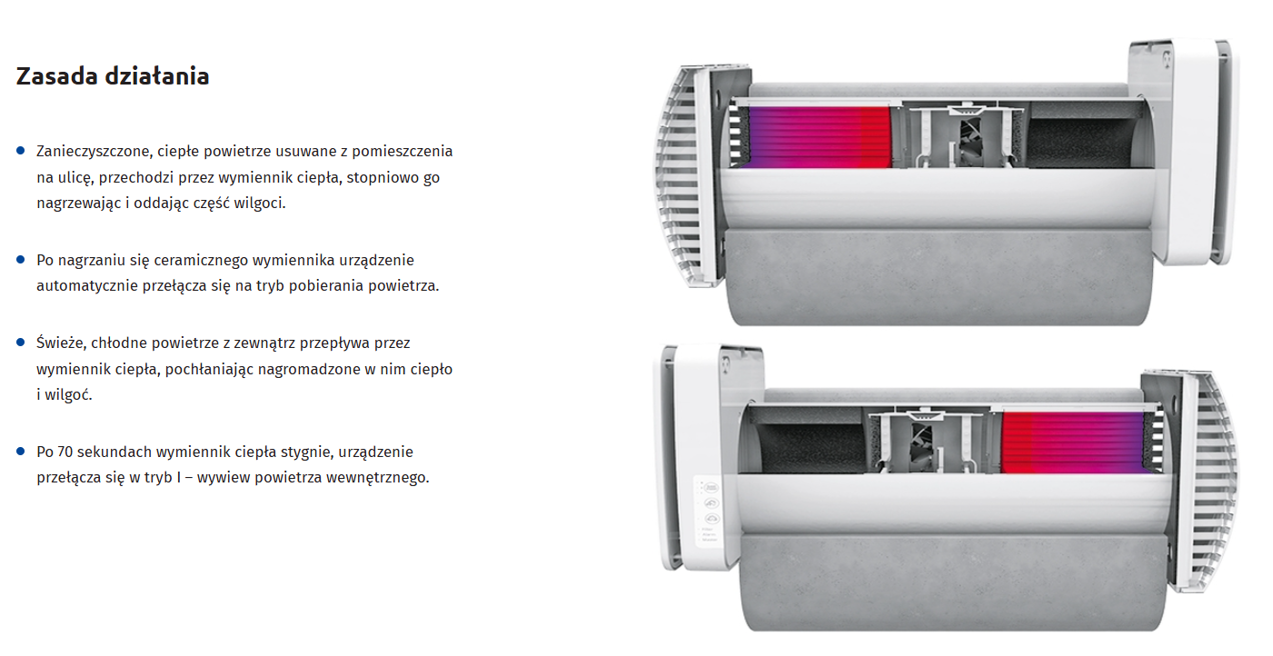 - Ciepłe, zużyte powietrze jest zasysane z pomieszczenia, przechodzi przez ceramiczny wymiennik ciepła i oddaje ciepło oraz wilgoć.