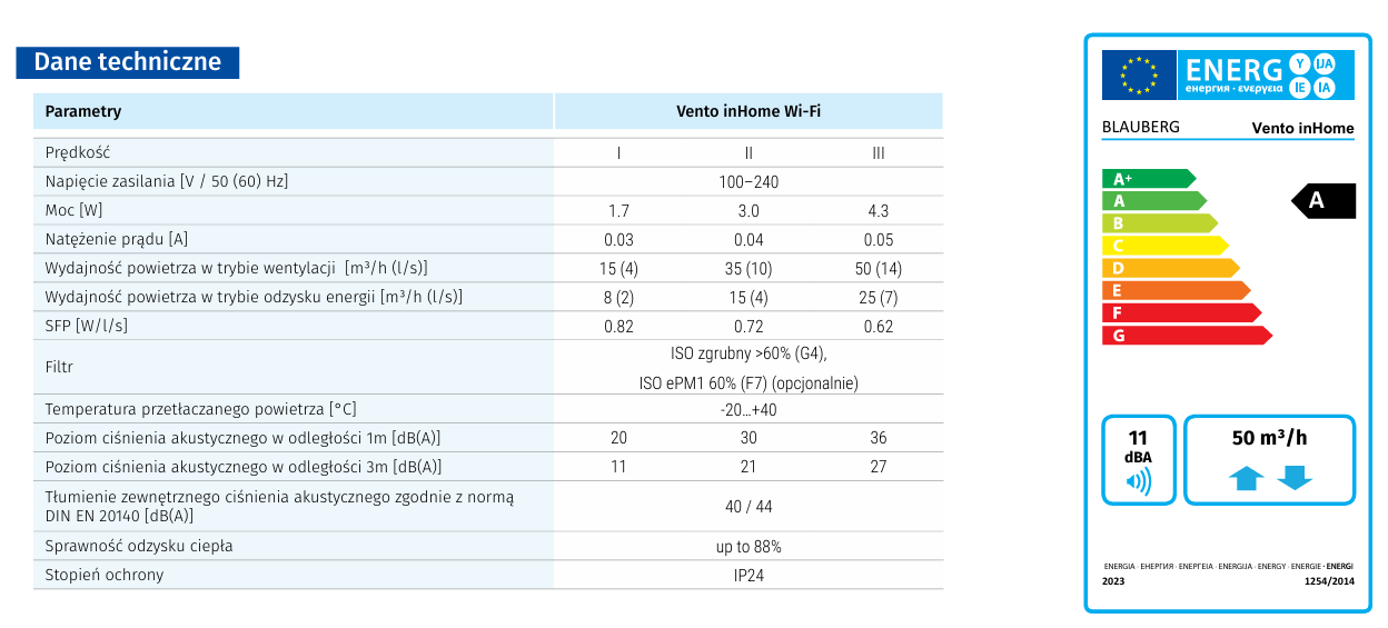 - Wydajność w trybie odzysku energii: 35 [m3/h]