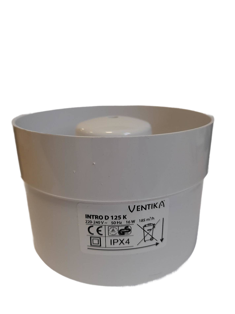 - Cichy wentylator kanałowy INTRO 125 VENTIKA, biały wersja standard. Przeznaczony do wentylacji wywiewnej i nawiewnej, w systemach kanałów wentylacyjnych PCV lub kanałów elastycznych. Idealny do WC, pralni, suszarni i łazienki.